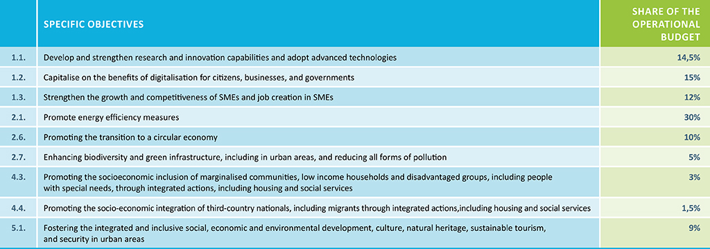 The table below presents the specific objectives, as selected by the Brussels-Capital Region, and their budget breakdown.